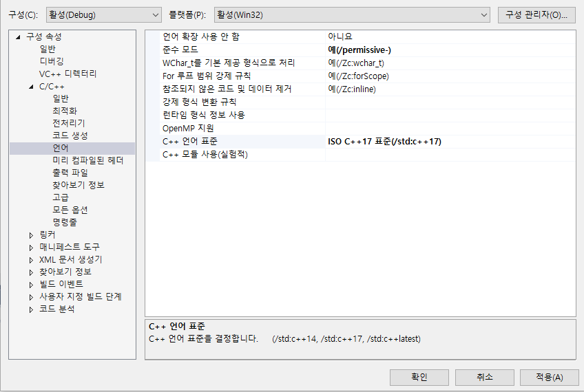 visual studio 에서 std::filesystem 사용을 위해선 다음과 같은 설정이 필요하다.
