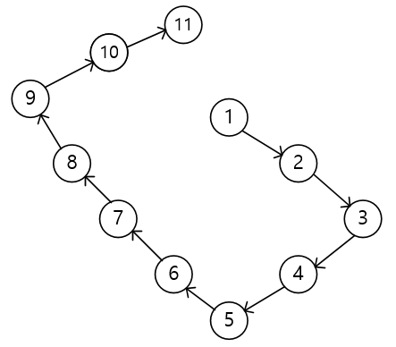 이 경우에는 시작 위치 1에서 시작 하지만 다시 돌아 올 수는 없다. 물론 반복이 끝나는 조건을 시작 위치로 돌아올 때 까지로 놓고 돌아 올 수 없는 경우면 경로 정보가 저장된 스택에서 pop하여 다시 탐색하는 구조로 작성하기는 했지만,