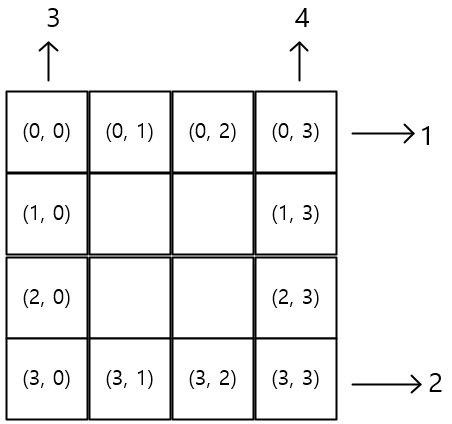 위 그림에서 화살표 1, 2는 상단, 하단 전부 약품으로 칠해진 셀이고, 이 때 y 는 0, (4 - 1) 이다.