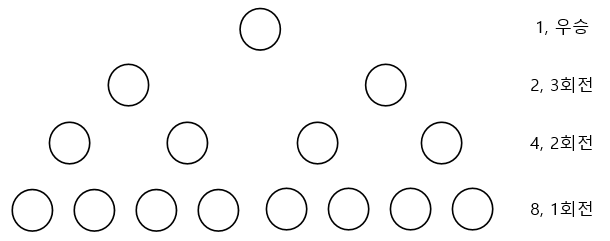 매 토너먼트 시 참가자의 수는 해당 회차전에서 둘 중 하나만 다음라운드로 진출하기 때문에 절반씩 줄어드는 것은 당연한다.