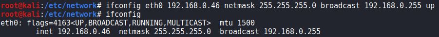 ifconfig "인터페이스 이름" "ip주소" netmask "넷마스크" broadcast "브로드캐스트 주소" up