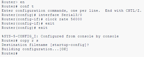 라우터1의 Serial 0의 클럭 속도를 56K로 설정하고 NVRAM에 저장하시오.