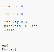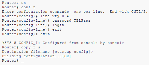 Router1 Telnet에 접근하는 Password를 "TELPass"로 설정하고, 상태를 저장하시오.