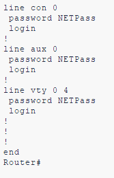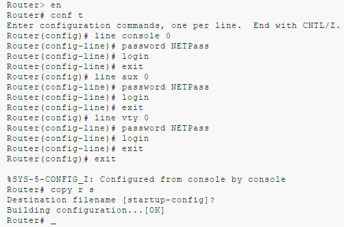 Router1 Console Port, AUX Port, Telnet 에 접근하는 Password를 "NETPass"로 설정하고, 상태를 저장하시오.