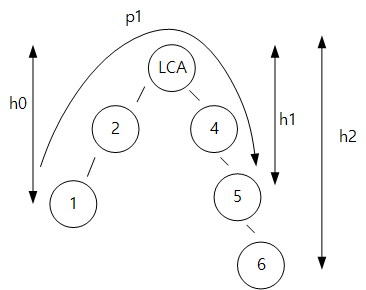 여기서 h1 은 1->K 까지 경로의 길이에서 1->LCA 까지 높이 차(=h0) 를 빼서 구할 수 있다.