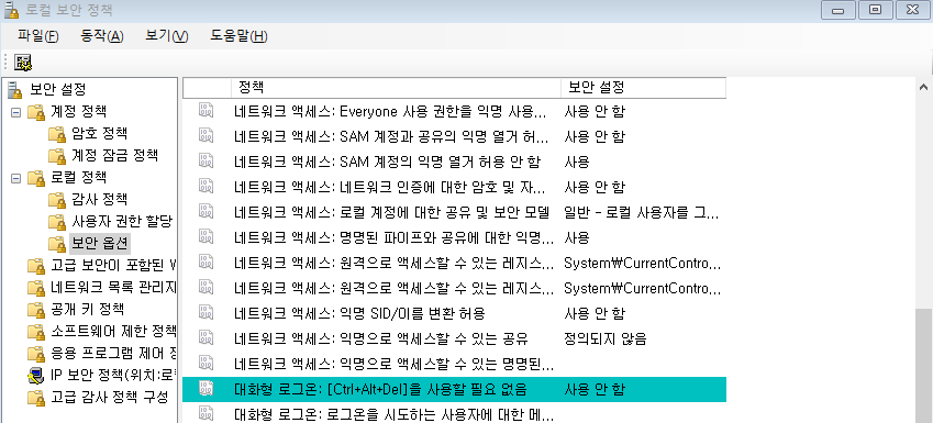 사용하지 않도록 설정이 되어 있으므로, 해당 정책의 보안 설정을 사용 안 함으로 바꿔주면 된다.